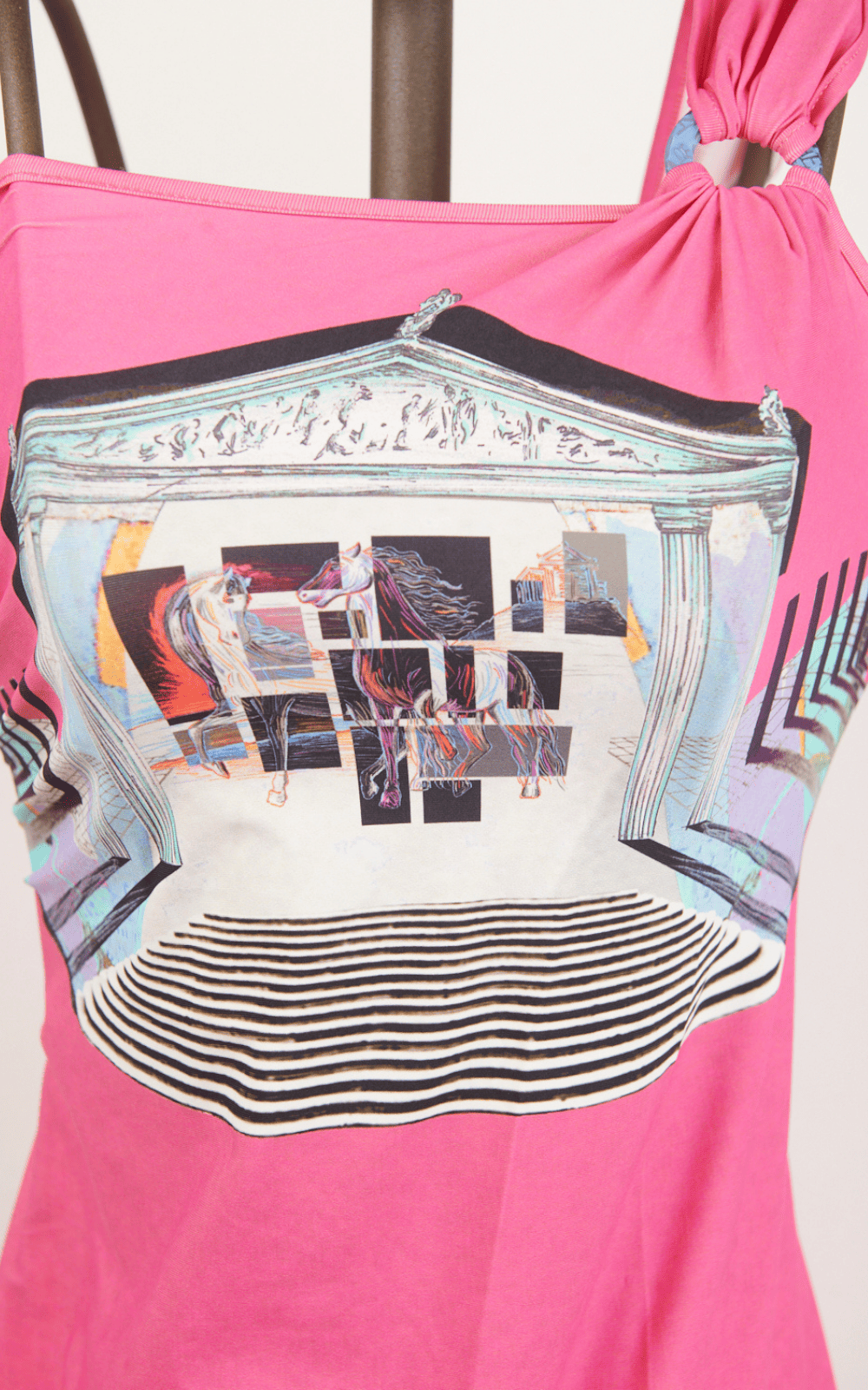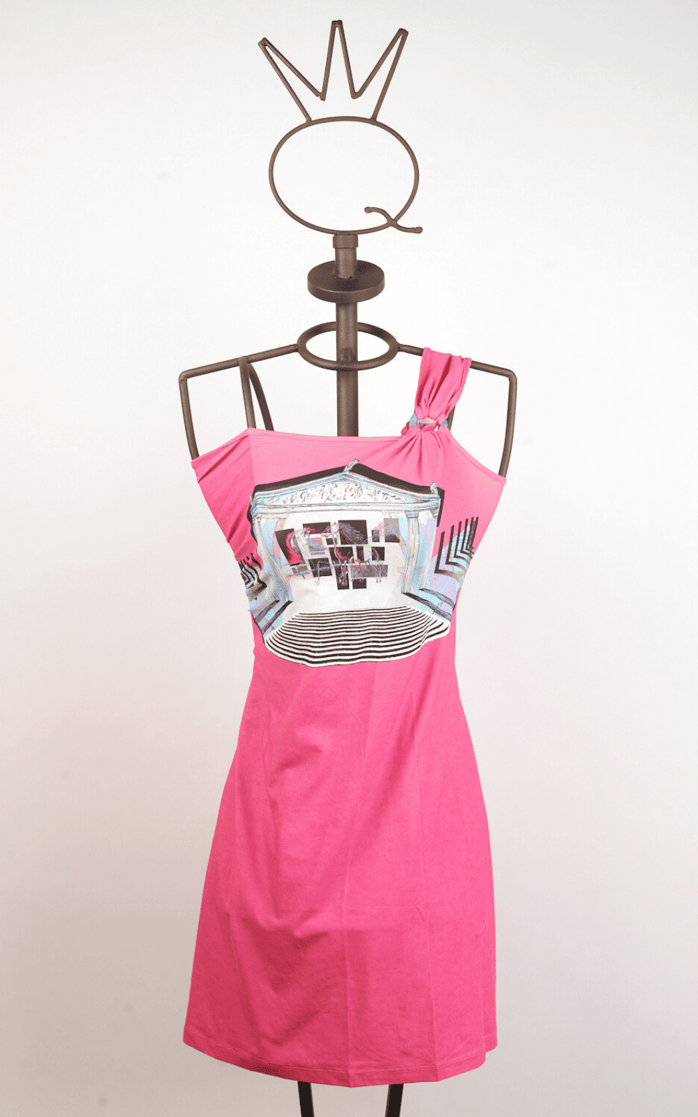 Mini abito fucsia monospalla, realizzato in morbido tessuto stretch, valorizzato sul fronte da una stampa ispirata all’Antica Grecia. La spallina, nello stesso tessuto, si unisce all’abito grazie a due anelli logati in PVC.  Linea svasata.