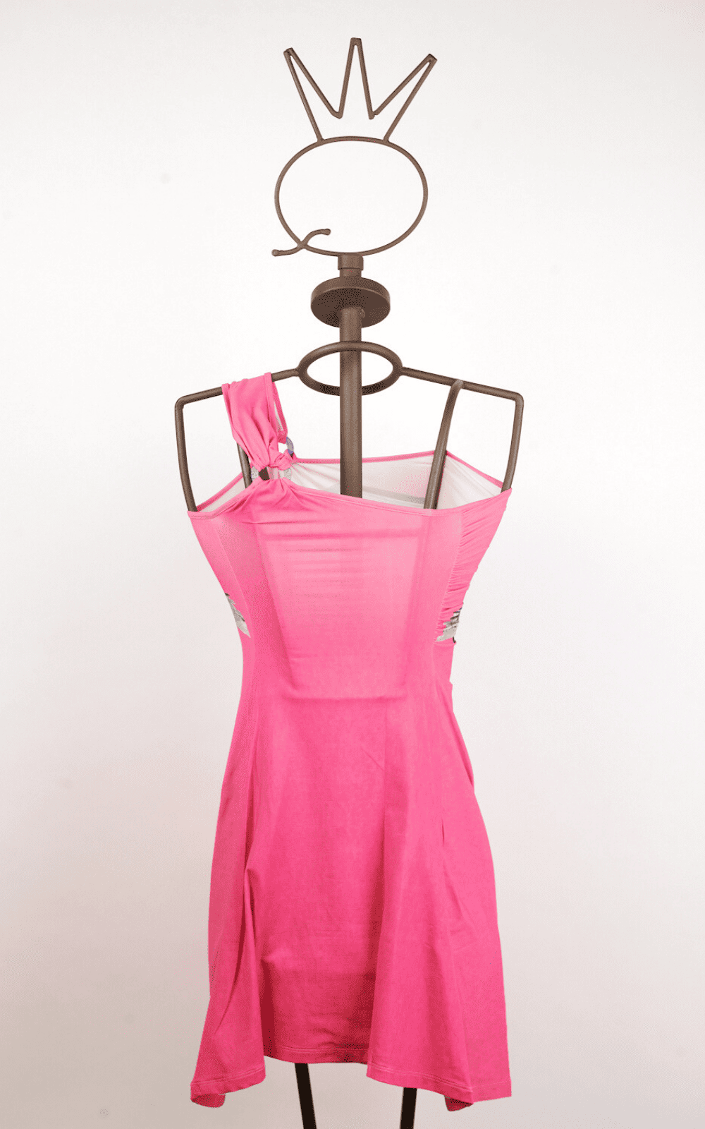 Abito estivo a righe bianche e nere con dettagli colorati, esposto su una gruccia artistica a forma di corona, ideale per look casual e alla moda.