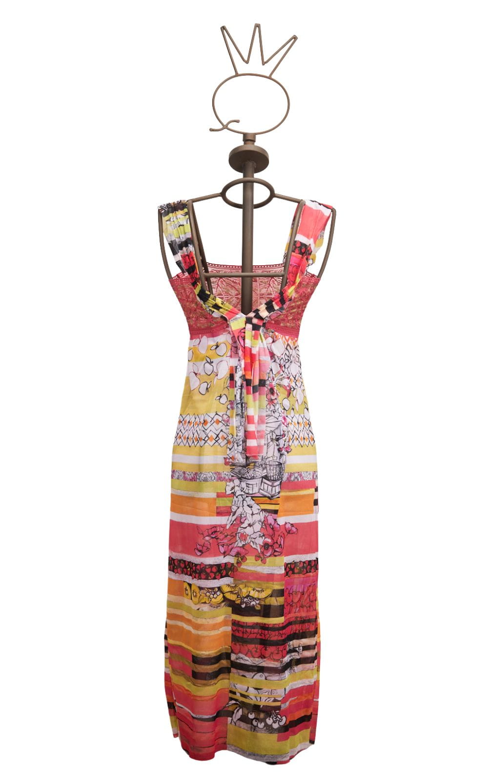 Abito estivo colorato con stampa floreale e righe, esposto su un manichino in metallo con una corona decorativa. Ideale per occasioni informali e look estivi.