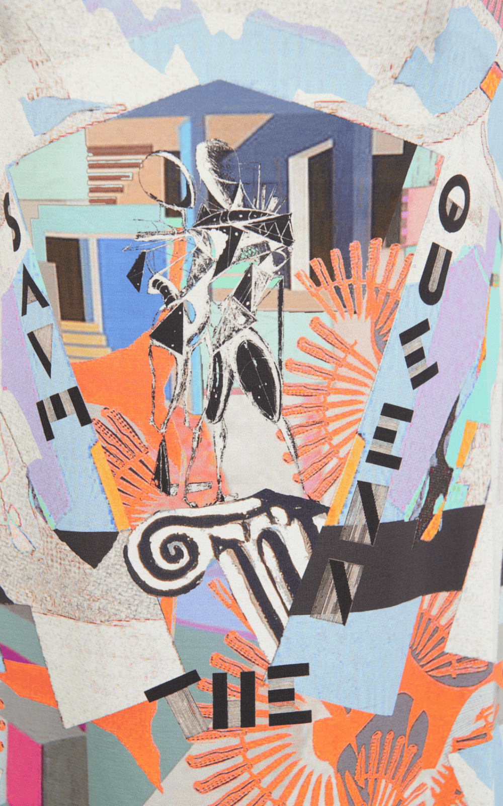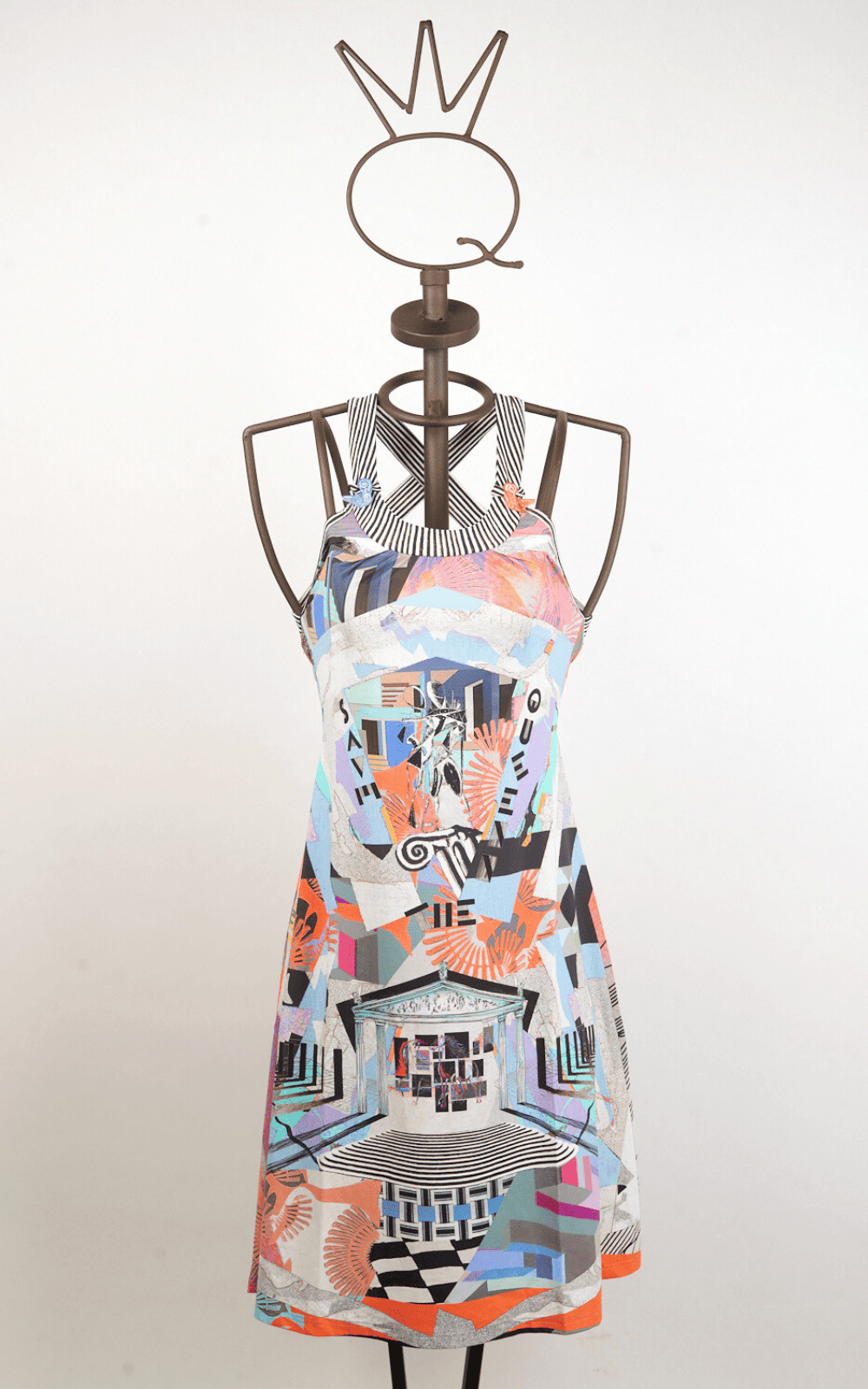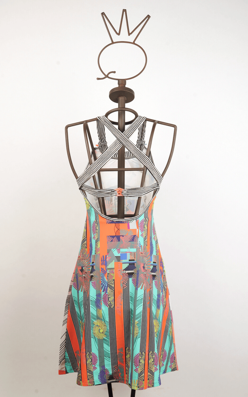 Vestito midi in morbido tessuto stretch, valorizzato da una stampa multicolore ispirata all’antica Grecia. Le ampie spalline in tessuto a righe bianche e nere, impreziosite da due accessori logati in PVC che richiamano la forma dei capitelli, si incrociano dietro la nuca creando un elegante effetto scollo all’americana. Sul retro, l’ampia scollatura rotonda è arricchita da una finta bretella e da una finta fibbia logata in PVC a forma di tempio. La linea svasata completa il modello con movimento e leggerezza.